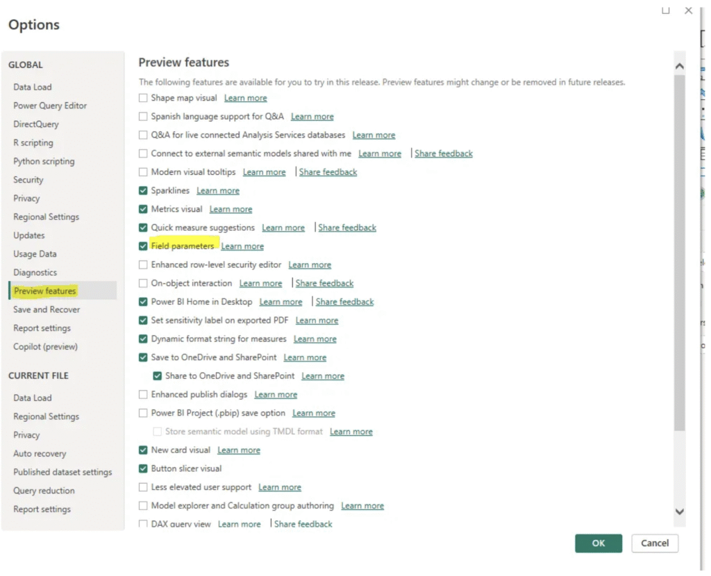 To use the Field Parameters feature, you need to activate the ‘Field Parameters’ option in the ‘Preview Features’ section.