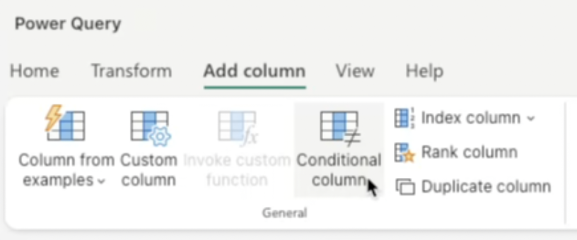 • Koşullu Sütun Seçin: Sütun Ekle şeridinde, “Koşullu Sütun” düğmesini bulun ve tıklayın. Bu, “Koşullu Sütun Ekle” iletişim kutusunu açar. Bu, herhangi bir kod yazmadan koşullarımızı tanımlamamıza olanak tanır.