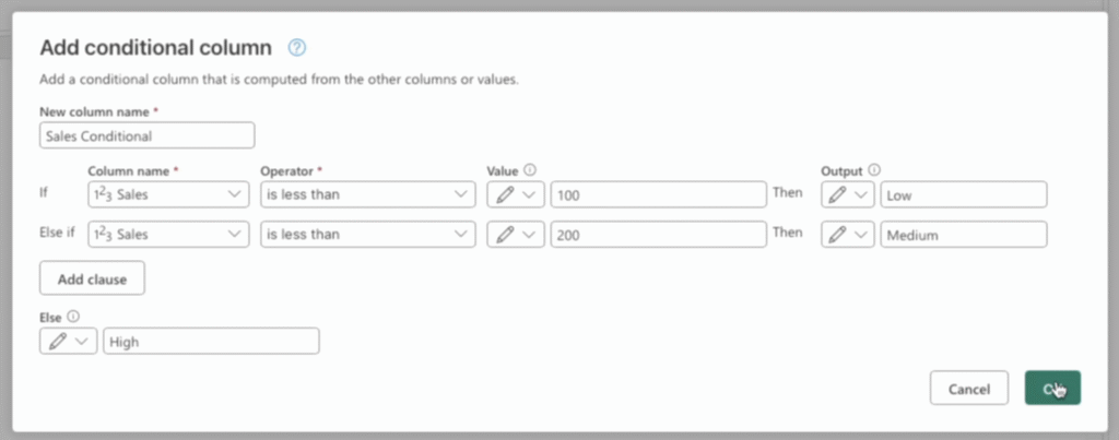 • Kod Yazmak Gerekmez: Kuralları açılır menüler ve giriş alanlarıyla tanımlayabilirsiniz. Arayüz sizin için temel formülü oluşturur, böylece Power Query koşullu mantığı arka planda uygulanır. Bu, kodlamaya alışkın değilseniz veya zaman kazanmak istiyorsanız harikadır.
