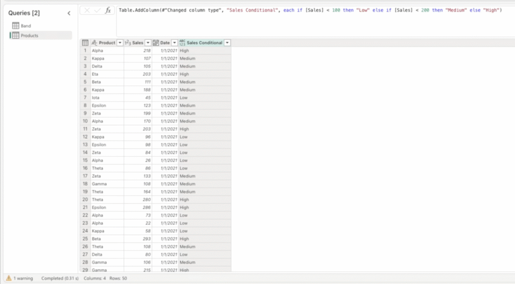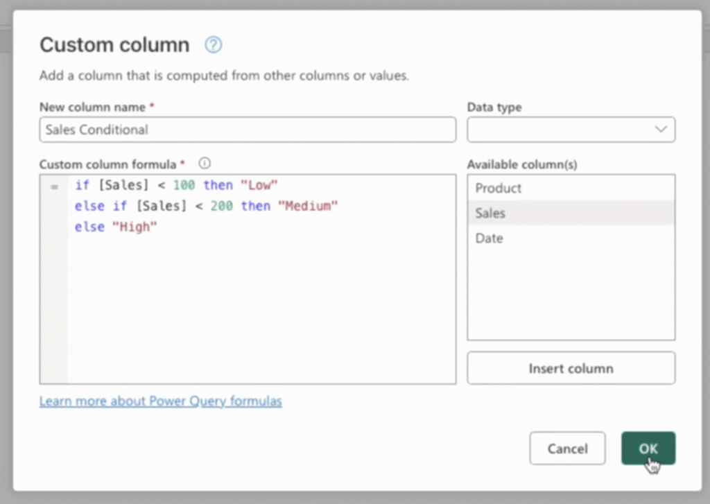 Eğer SalesAmount 100’den küçükse Low; Else if SalesAmount 200’den küçükse Medium; Aksi halde (Else) High. Her şey düzgün görünüyorsa “Tamam”a tıklayın. Power BI kutusunu kapatır ve belirttiğiniz kurallara göre tablonuza yeni bir sütun ekler.