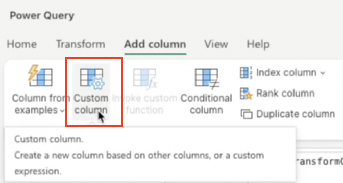 • Özel Sütun Seçin: Sütun Ekle şeridinde, “Özel Sütun” düğmesini bulun ve tıklayın. Bu, “Özel Sütun Ekle” kutusunu açar. Bu, kod yazarak kurallarımızı belirtmemize olanak tanıyan temel özelliktir.