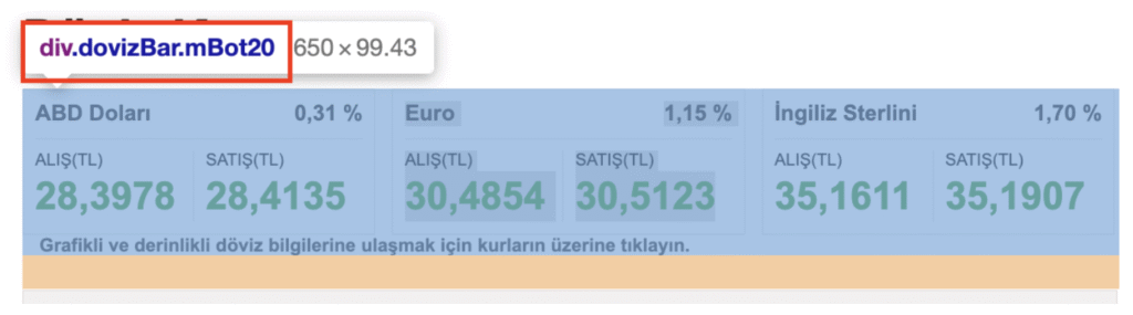 Web sitesinde, ABD Doları, Euro ve İngiliz Sterlini div.dovizBar.mBot20 içinde.