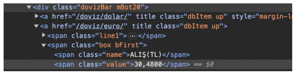 USD, EURO ve STERLIN için HTML’ye sahip olarak. Bilgiyi çıkaralım:
