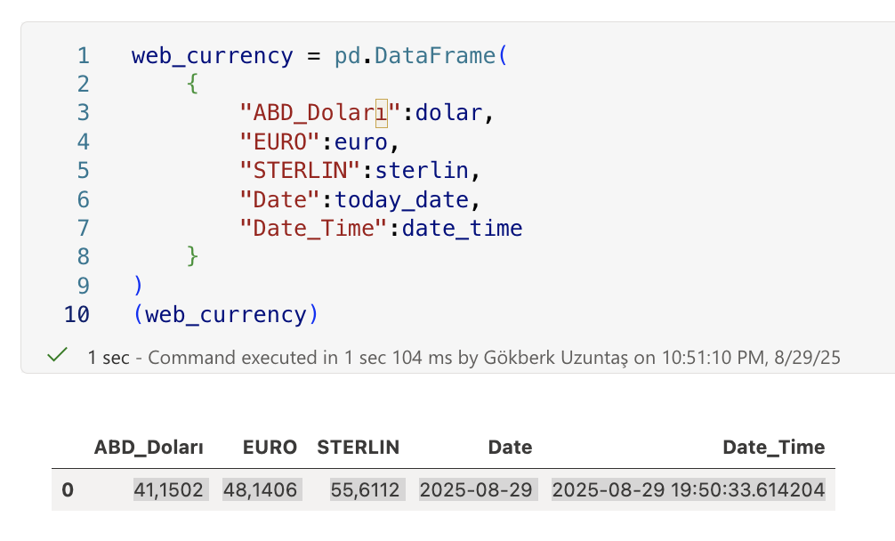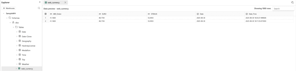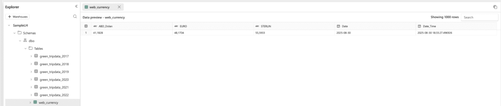 Artık Hurriyet/Doviz’den verilerimiz var. Bu verileri Lakehouse veya Warehouse içerisine depolayabiliriz. Daha sonra bu veriyi Lakehouse veya Warehouse içindeki test tablosu web_scrap_datas içine aktarabiliriz.